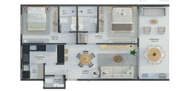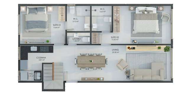 Unidades de 02 Suítes: Plantas de 77,96 m², 78,05 m² e 80,15 m² (01 vaga de garagem).