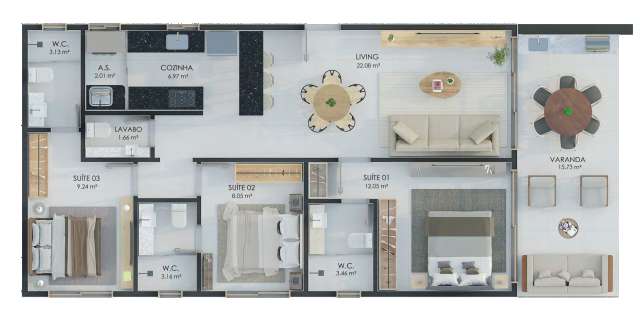Unidades de 03 Suítes: Plantas de 100,41 m² a 100,49 m² (02 vagas de garagem).